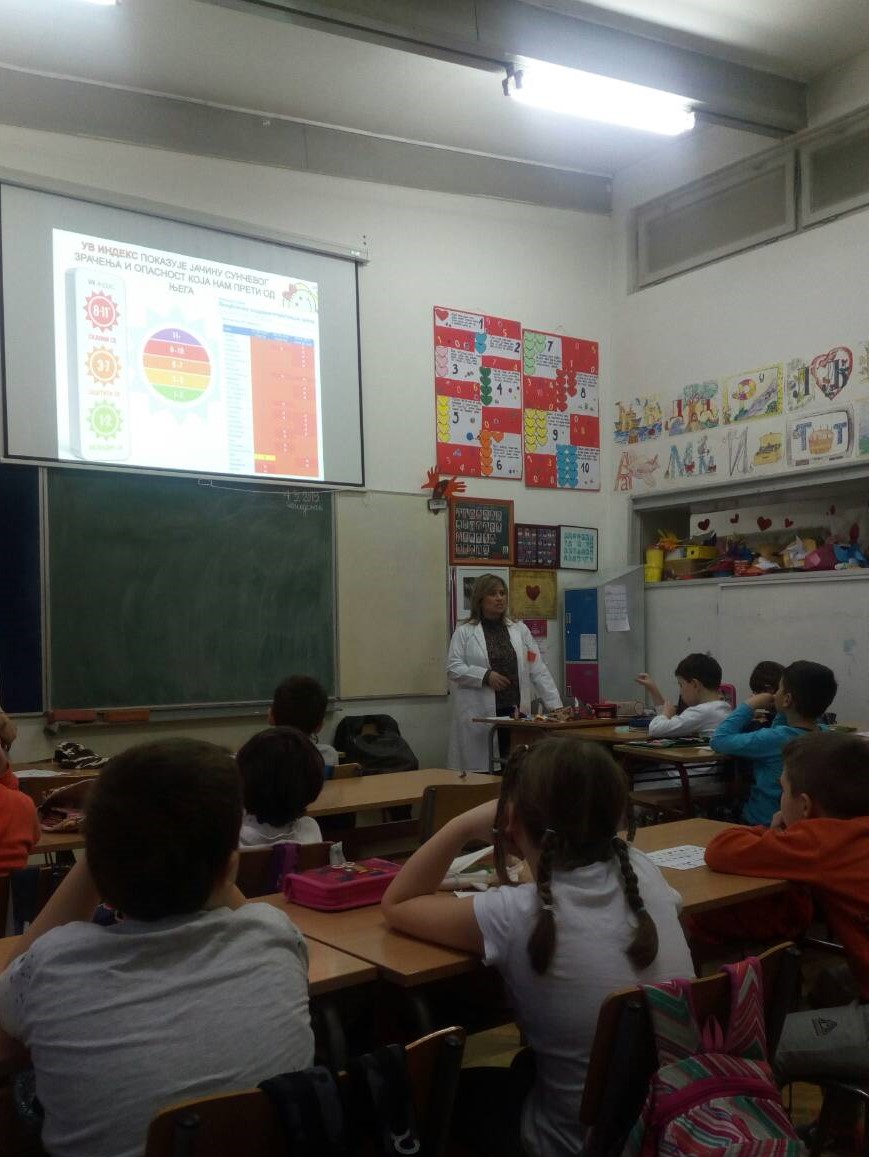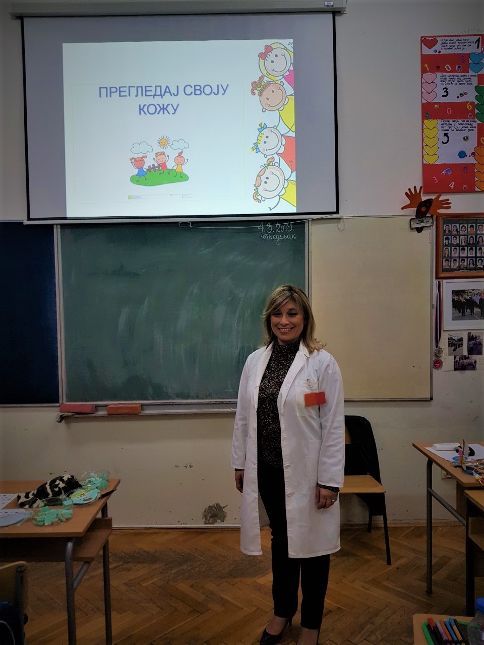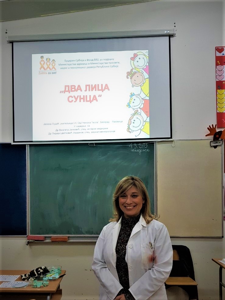 Dana 04.03.2019. god. dermatolog Lidija Cvetković Jordanov je imala čast da bude gost učenicima I- 4 razreda O.Š. “Nikola Tesla” u Beogradu, na poziv njihove učiteljice Jelene Lucić. Učenici su tokom prezentacije aktivno učestvovali i upoznali se sa osnovnim pojmovima vezanim za tipove i pregled kože, indeks UV zračenja i posledice neadekvatne zaštite od Sunca. Posebna pažnja je bila posvećena bezbednom ponašanju na Suncu: “sigurno vreme” boravka, korišćenje zaštitinih naočara, šešira, garderobe i preparata sa visokim faktorima zaštite. Tokom nekoliko kreativnih radionica učenici su pravili zanimljive naočare, koje su ujedno bile i poklon mamama za 8. mart, a ocrtane šake sa porukom kako se oni sami štite od Sunca, su postale zraci jednog ogromnog, nasmejanog Sunca.
